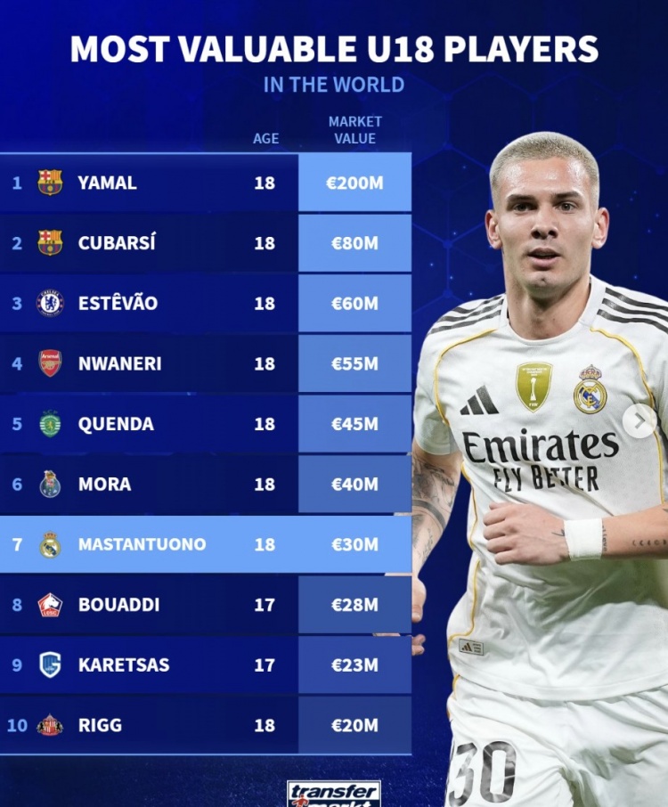 Không đăng lại mà không được phép:G1News » Người chơi U18 Top Ten: Yamal dẫn 200 triệu euro, Kuba, Mastantono đứng thứ hai