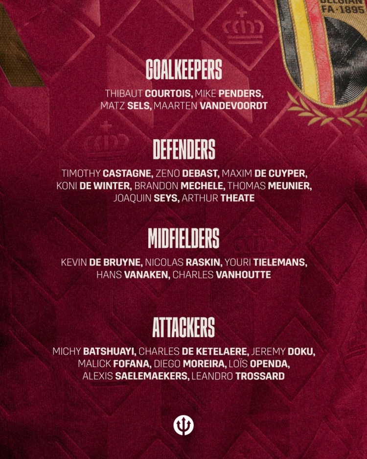 Đội tuyển quốc gia Bỉ đã công bố đội hình cho World Cup vào tháng 9, như sau: Courtois Courtois (Real Madrid) Qupe (Brighton), de Winter (AC Milan), Mecher (Bruges), Munier (lier), sis (bruges), Tate (Frankfurt)